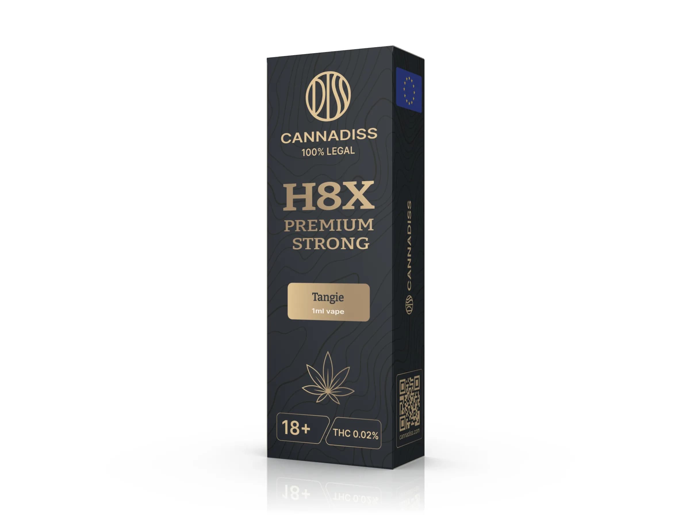 Disposable vape Tangie H8X Premium Strong (Cannadiss) — a next-generation premium product that guarantees powerful, harmoniously balanced, and controlled sensations. The first effects appear approximately 5–10 minutes after the start of use. The profile is described as euphoric, clear, and stable, with a character often compared to a THC-like feeling, given the legal THC level (≤0.2%).