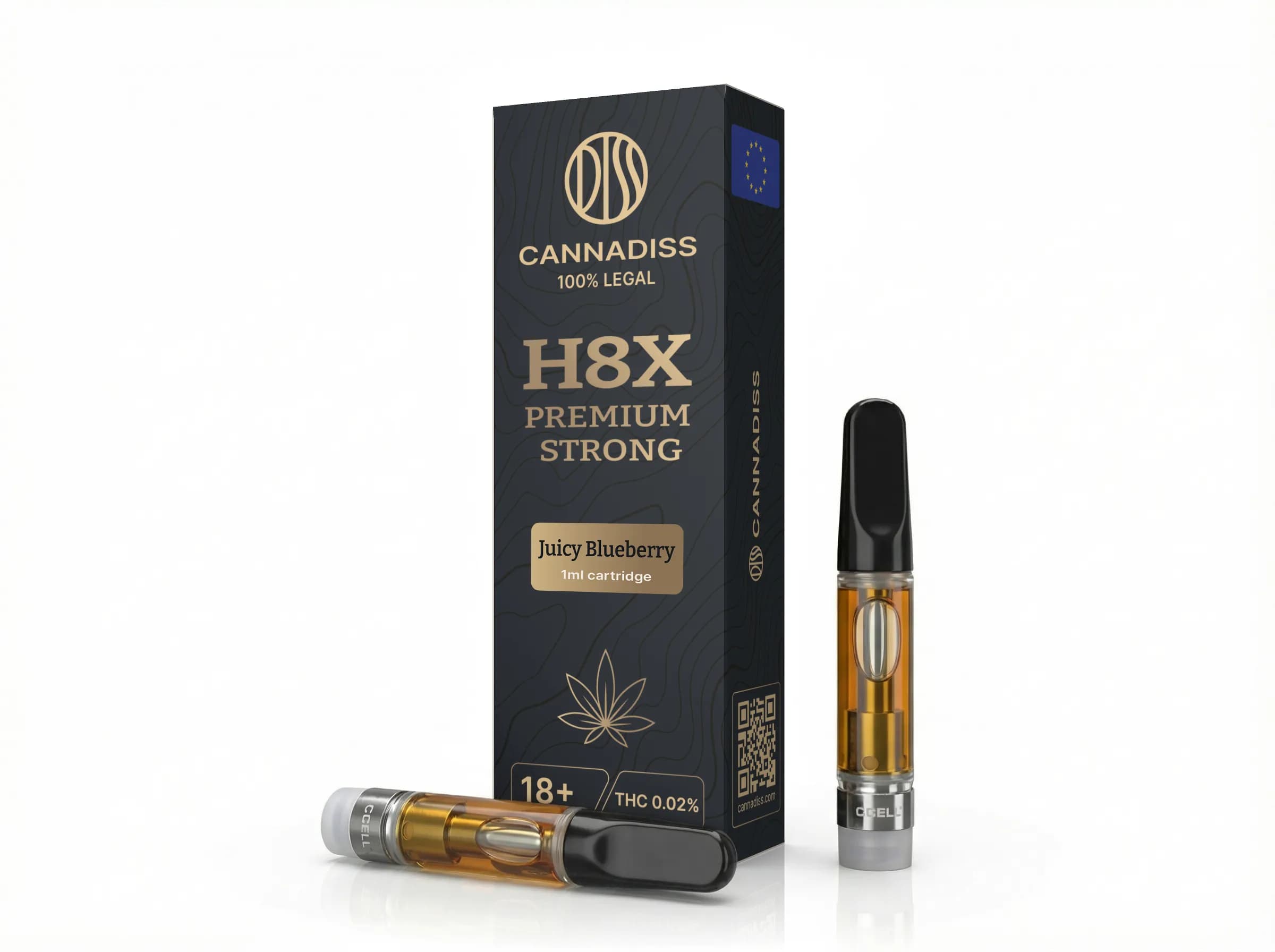 510 Standard Cartridge Juicy Blueberry H8X Premium Strong (Cannadiss) — a new generation premium product, designed for the purest transmission of the H8X profile. Compatible with most 510 batteries, it provides smooth and predictable inhalation. The effect is intense but controlled, unfolding gradually. The sensation is often described as deep and euphoric, similar in character to THC, with a legal THC level (≤0.2%).